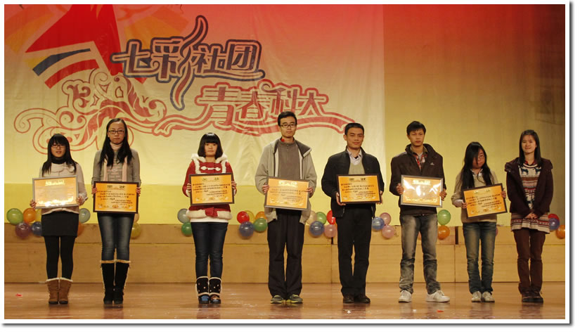 2012年12月2日晚,我校第十三届学生社团文化节闭幕式暨颁奖晚会在东区大礼堂顺利召开,同时也标志着主题为“七彩社团,青春科大”的第十三届学生社团文化节圆满落幕。