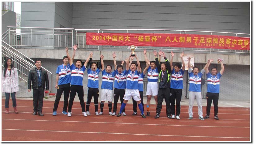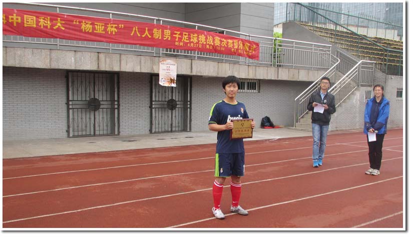 2014年4月27日星期日上午,由校团委、校学生社团管理指导委员会主办,杨亚校友基金协办,校学生足球协会承办的第四届中国科大“杨亚杯”八人制男子足球挑战赛决赛暨闭幕式在东区足球场进行。校团委张平老师,校学生社团管理指导委员会李晨晖同学、校学生足球协会孙赵亿同学等出席了闭幕式,并为获奖球队和个人颁奖。至此,历时近两个月的第四届中国科大“杨亚杯”八人制男子足球挑战赛圆满落下帷幕。